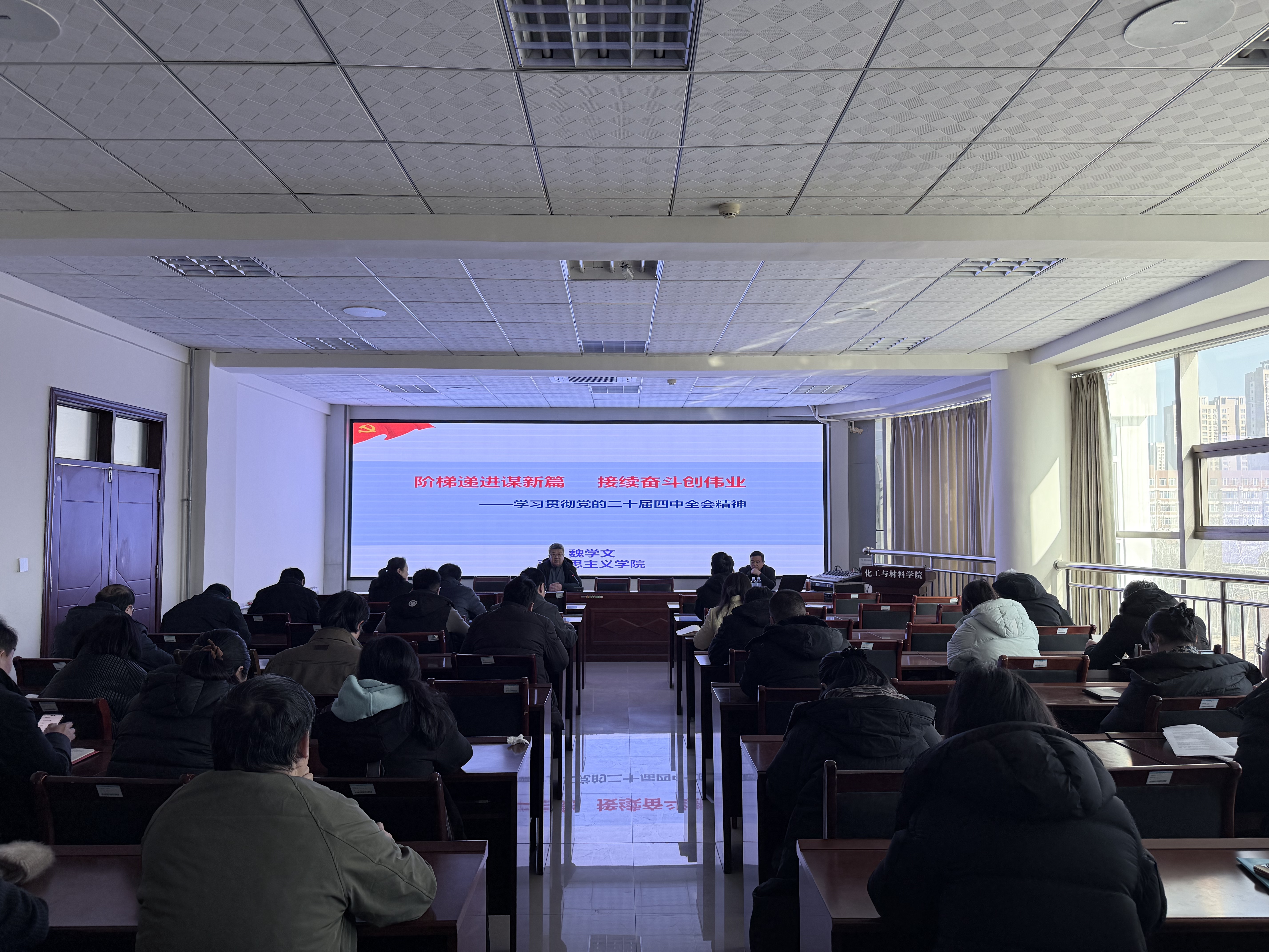 为深入学习领会、全面准确把握党的二十届四中全会精神的核心要义,化工与材料学院党委1月13日在9-313会议室举办了“党的二十届四中全会精神解读”专题讲座。本次讲座特邀学校宣讲团成员、马克思主义学院魏学文教授担任主讲。讲座由学院党委书记主持。学院党政领导班子成员、全体教职工党员及部分师生群众参加了学习。